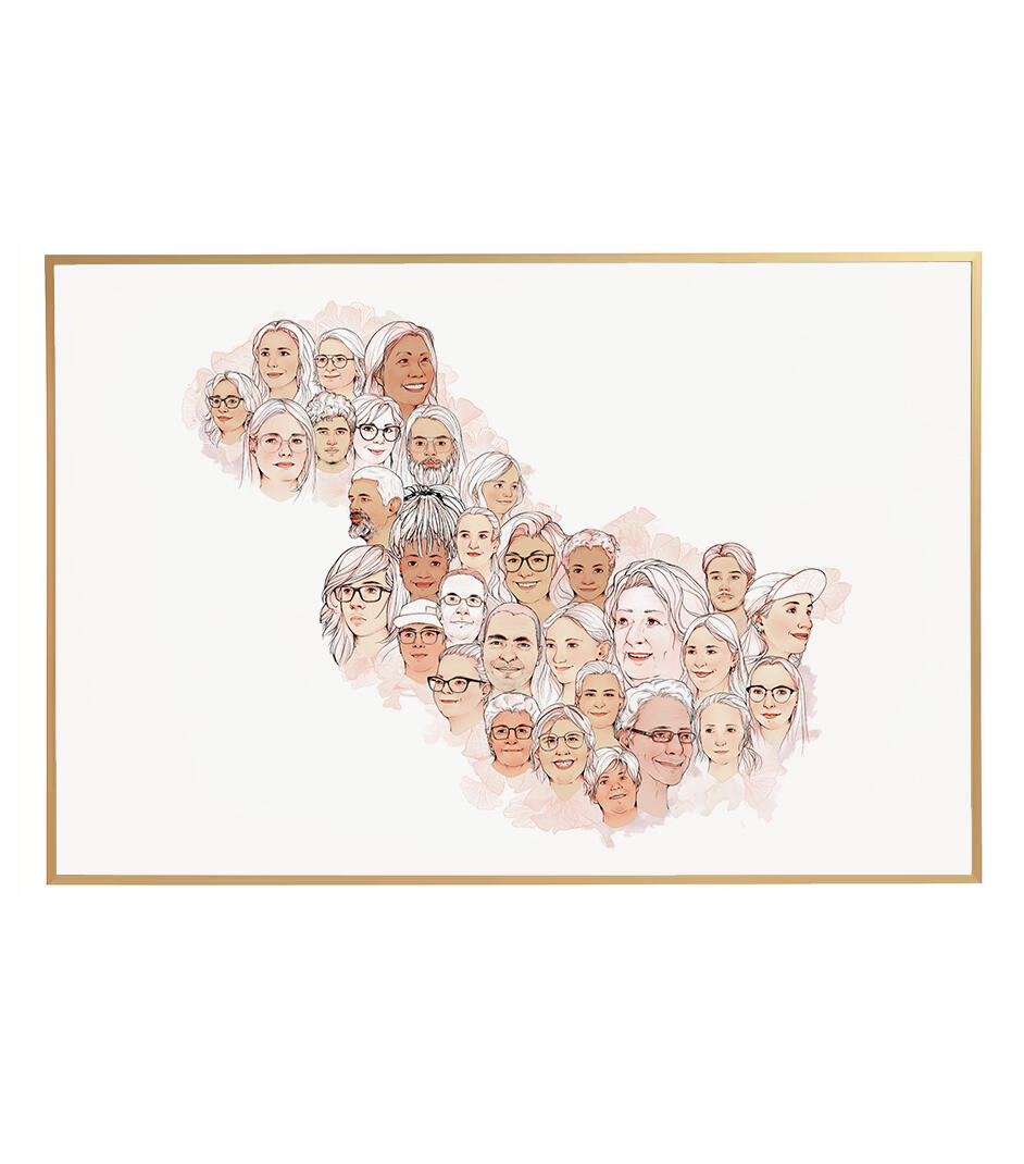 Tous les résidents de Drummondville ont été invités à participer. Ce concept va au-delà des entrepreneurs, personnalité publique et des hauts faits sociaux. L'artiste s'engage à créer des liens avec sa communauté en se fondant sur les valeurs de respect, de réciprocité, de transparence, d’ouverture, de diversité et d’inclusion. De ces esquisses en résulta une oeuvre communautaire et unique produite numériquement à l'aide d'un logiciel de dessin puis imprimé en grand format. Un amalgame de visages composera un agencement organique qui suggère la topographie de Drummondville.